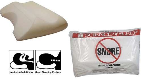 Snore No More pillow safely reduces or stops snoring and relieves mild sleep apnea without medication. This doctor-designed pillow promotes a comfortable side sleeping position elevating chin off chest that opens airways to provide abetter night's sleep for both you and your partner. Urethane foam with a zip-off polycotton blend cover, 21 x 15 x 5". Uses standard pillowcase